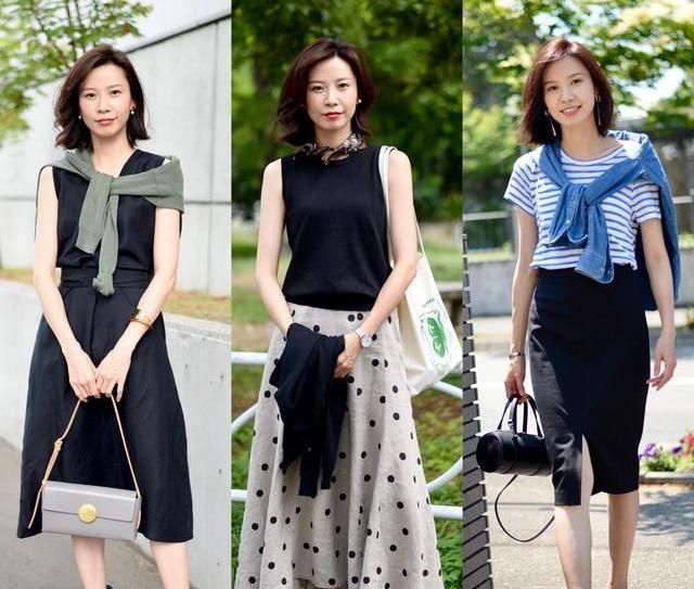 与清爽干净的白色不一样,黑色会彰显成熟又稳重的感觉,更适合40岁以上的女性选择。选择一件黑色无袖收腰款连衣裙,搭配同色系的坡跟鞋,成熟知性。为了避免大面积黑色所带来的沉闷单调感,在肩上又搭配了一件绿色披肩,点亮整体色彩。黑色无袖T恤搭配灰色波点半身裙,换上经典帆布鞋,休闲又舒适,再搭配一条小丝巾,更显得精致得体。